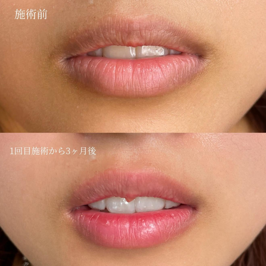 当院のリップアートメイクはグラデーション仕上げのため、輪郭が強調しすぎることなく、自然に唇が色づいたような仕上がりになります。