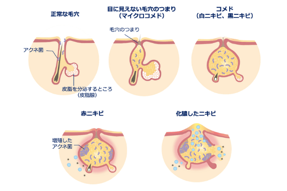 これらが連鎖することで、初期の「コメド(面皰)」から、炎症を伴う「赤ニキビ」「黄ニキビ」へと進行します 。