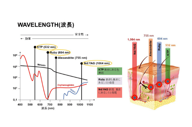 特に、ルビーレーザー(694nm)は、メラニンへの吸収率が非常に高く、周囲の組織へのダメージを最小限に抑えつつ、ターゲットの色素を強力に粉砕することができます。
