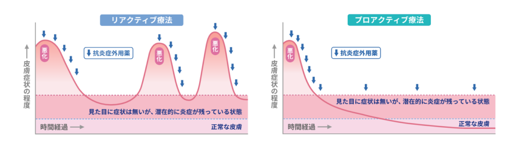 従来の「悪くなった時だけ薬を塗る」リアクティブ療法では、見た目が改善した直後に中止するため、皮下に残る「火種(微小炎症)」から早期に再発してしまいます 。 これに対し「プロアクティブ療法」は、一旦寛解させた後も、週に2回など間隔を空けて、もしくは非ステロイド性の抗炎症薬を用いて、定期的に外用薬を継続し、再燃を未然に防ぐ標準治療です 。