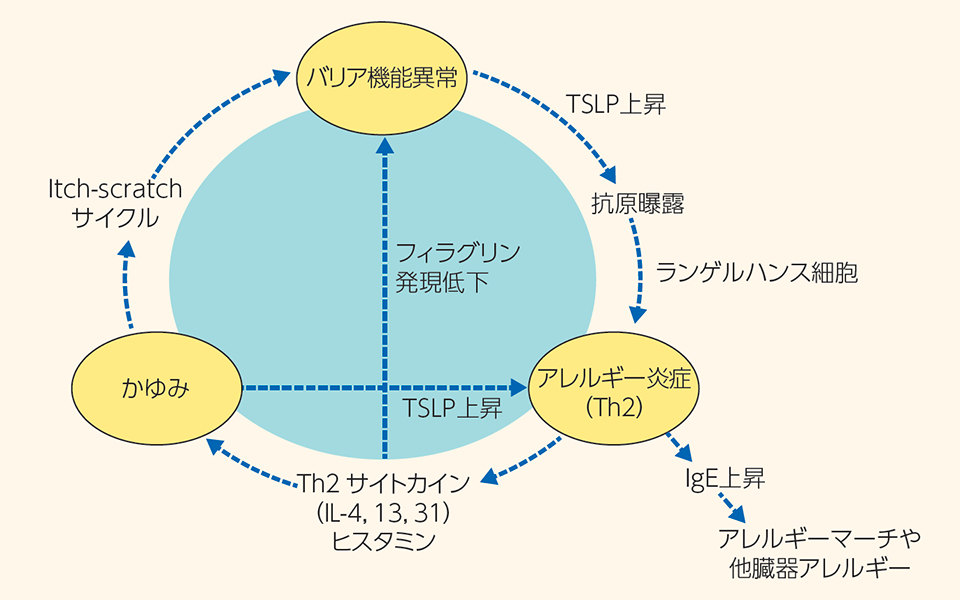 アトピー性皮膚炎の病態は、「皮膚バリア機能の低下」「アレルギー性の炎症」「かゆみ」の3つの要素が複雑に絡み合っています 。